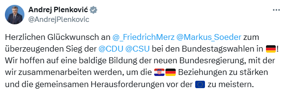 Noch bevor die Bundeswahlleiterin das vorläufige Wahlergebnis verkündet hatte, gratulierte Ministerpräsident Andrej Plenković auf der Plattform X der CDU und der CSU zum Gewinn der Wahl. Mit seinen gratulierenden Worten teilte er zudem ein Foto, dass ihn zusammen mit Friedrich Merz zeigt.